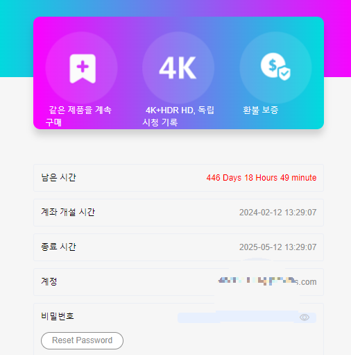 4. 결제를 완료했다면 "구독"메뉴로 이동해 공유되어있는 계정과 비번으로 하시면 됩니다. 구독에 이용권 표시가 되지 않는다면 메일을 확인하시면 메일이 10분안에 옵니다.