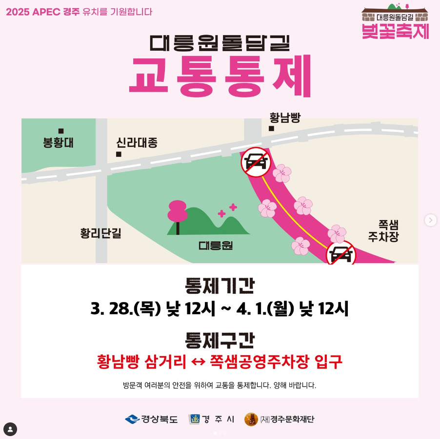 3월 28일 낮 12시부터 4월 1일 낮 12시까지 황남빵 삼거리에서 쪽샘공영주차장 입구까지 도보 이용객의 관람 편의를 위해교통이 통제됩니다.
